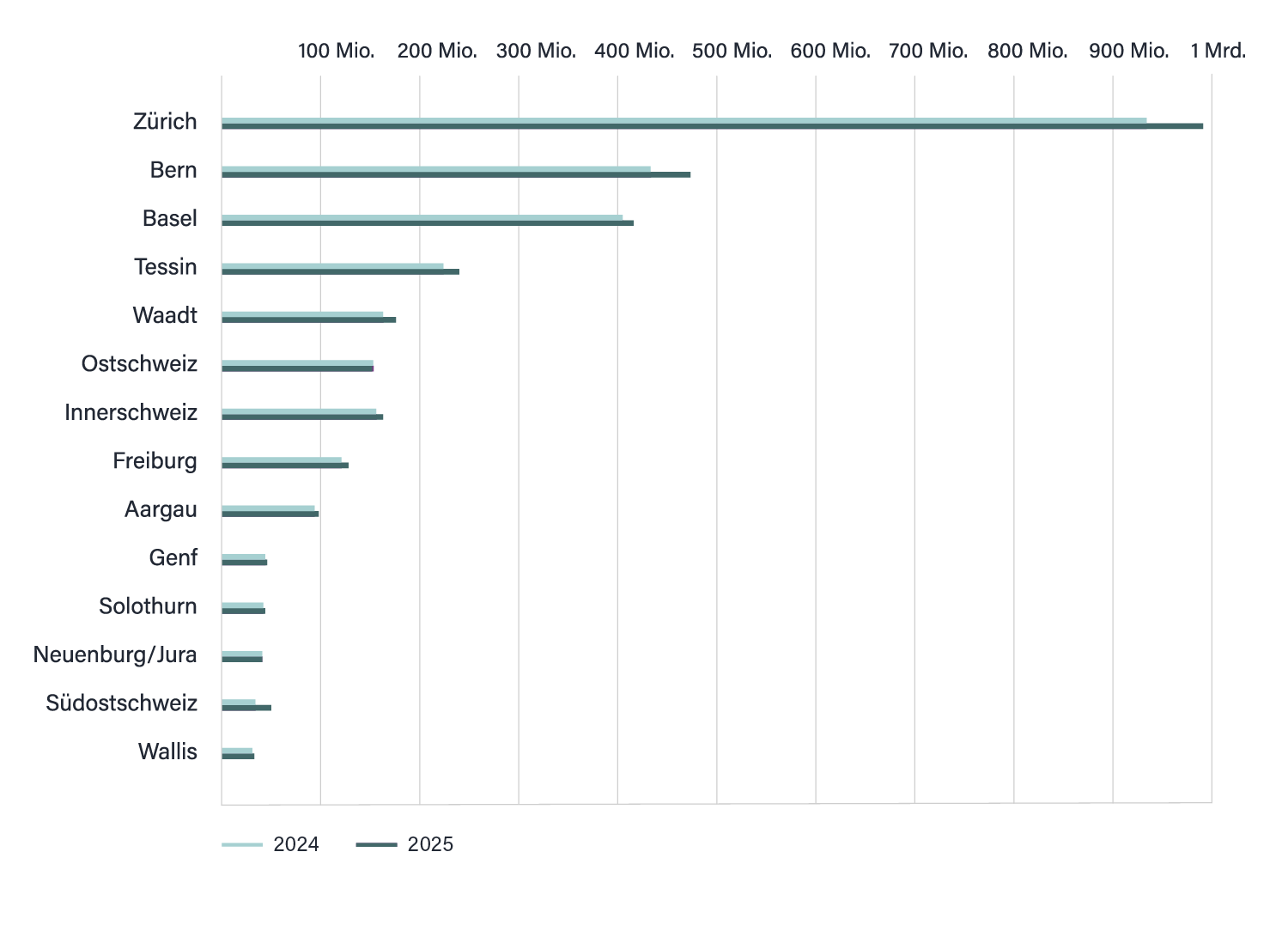 Mitgliedsunternehmungen und Zweigstellen2024:472025:46Mitarbeiterzahlen2024:12412025:1329Durchschnittliche Anzahl Mitarbeitende pro Unternehmung2024:26.402025:28.89Bruttoumsatz der Mitgliedsunternehmen pro Region in Mio.2024:2242025:240Waadt